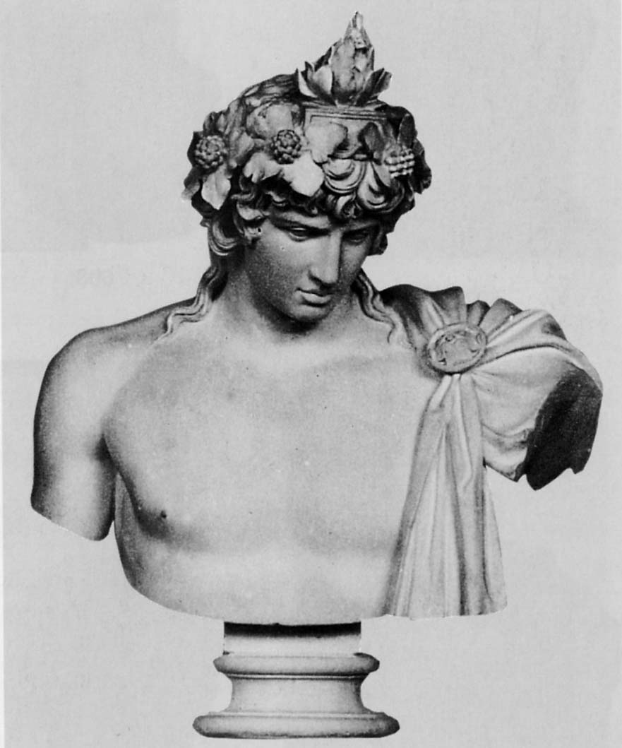 Kopf des Antinoos-Dionysos auf nicht antiker Büste. Höhe 60 cm. Original: